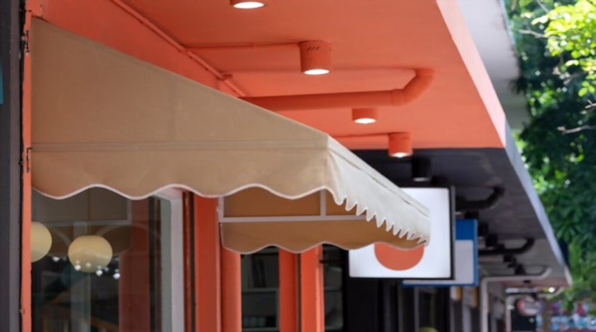 Dado que la tela o cenefa corre verticalmente hacia abajo y es visible tanto cuando la tela del toldo está extendida como retraída, a menudo se usa en el sector de la restauración o el comercio minorista con fines publicitarios.